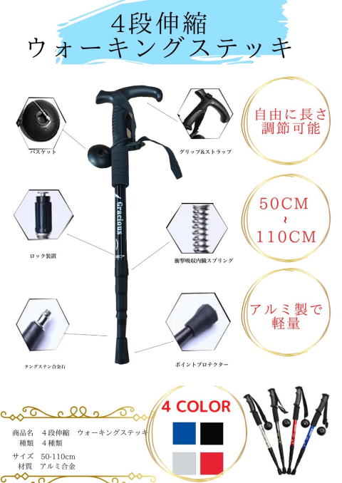 4段伸縮 ウォーキングステッキ Ⅼ字タイプ