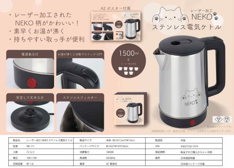 レーザー加工 NEKO ステンレス電気ケトル