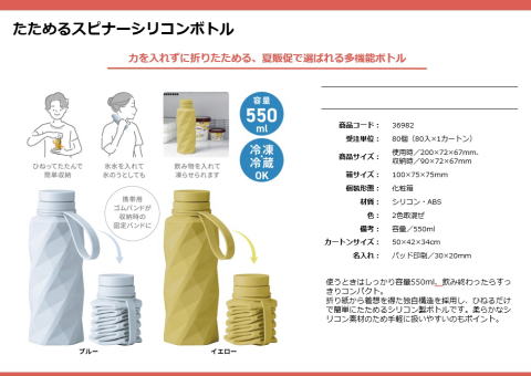 折り紙から着想を得た独自構造を採用し、ひねるだけで簡単にたためるシリコン製ボトルです